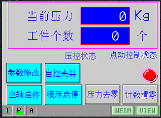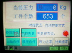 現(xiàn)對以上界面作以下介紹 當(dāng)前壓力:指當(dāng)前工件所承受的壓力。 工件個數(shù):已加工工件的個數(shù)。 壓控狀態(tài):在手動和自動狀態(tài)下,主軸的返回是受壓力控制的。 點動控制狀態(tài):它是指示面板上功能控制開關(guān)當(dāng)前的位置,分別有點動控制狀態(tài)、手動控制狀態(tài)、自動控制狀態(tài)。 主軸啟停:按此按扭將打開如下畫面